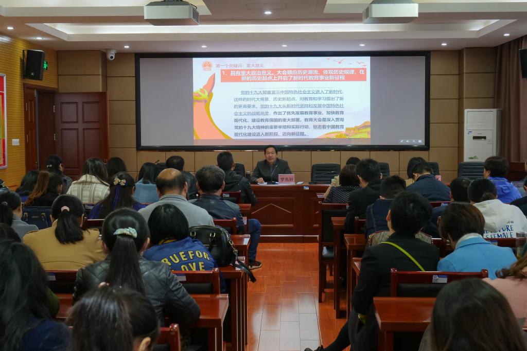 党委书记罗兆好用重大意义,根本要求,根本任务,政治原则、发展道路、价值追求,深化改革,队伍建设,质量水平,落实落地八个关键词,对习近平总书记在全国教育大会上的重要讲话作了全面宣讲和深入解读。他指出,习近平总书记围绕培养什么人、怎样培养人、为谁培养人这一根本问题,系统阐释了当前国家教育发展事业的一系列新理念新思想新观点,提出了新的工作要求,作出了新的战略部署,为加快推动教育现代化、建设教育强国、办好人民满意的教育指明了方向。讲话高屋建瓴、内涵丰富、逻辑严谨且方向明确。