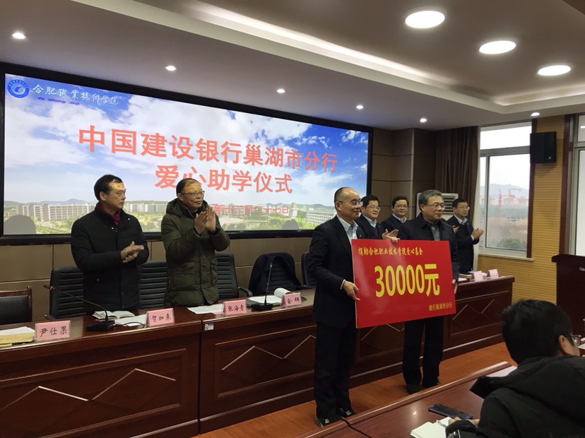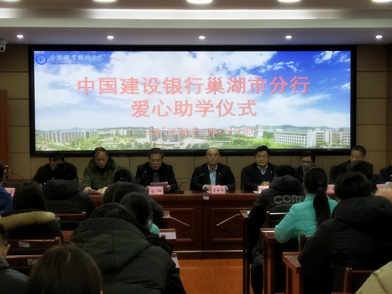 12月27日下午,中国建设银行巢湖市分行爱心助学捐助仪式在Beat365鼓山校区五楼会议室举行。校纪委书记、关工委主任金辉,建行巢湖市分行副行长李雄伟、纪委书记周臣宝出席仪式。建行巢湖市分行相关部门负责人、校关工委部分委员、各学院资助工作专职辅导员和20名受助学生参加了仪式。仪式由学生处副处长、关工委秘书长尹仕果主持。