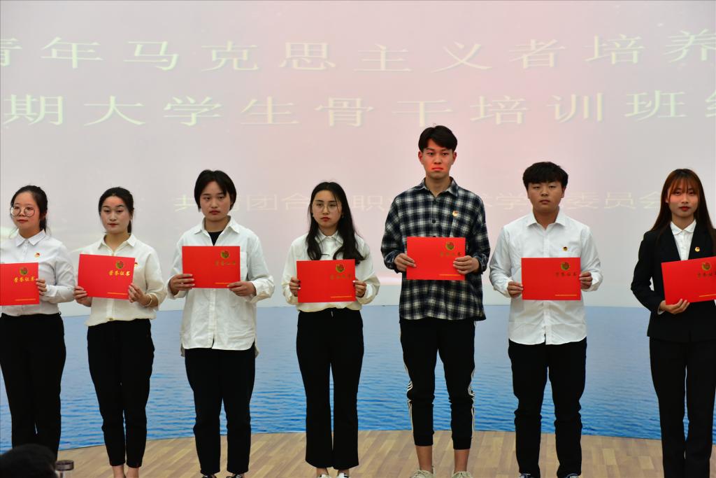 在高昂的团歌声中结业仪式正式开始。与会人员通过视频共同回顾了第九期青马班的学习历程。本届参训学员360名,分为两个校区12个教学班级,聘任12位教师指导班级学习活动。培训从2018年12月开始,包括理论学习、社会实践、红色教育、素质拓展四个环节,采取集中学习和分散学习两种方式进行,主要教学活动有微团课竞赛、书法大赛、辩论赛、学雷锋志愿服务、寒假社会实践等。通过综合考评,评出36名优秀学员、4名优秀指导教师和4个优秀班级。与会领导为受表彰的集体和个人颁发了锦旗和证书。优秀学员代表吴静文优秀指导教师代表徐亚飞分别分享了心得收获,并表示在今后的学习工作会继续努力,不断提升。