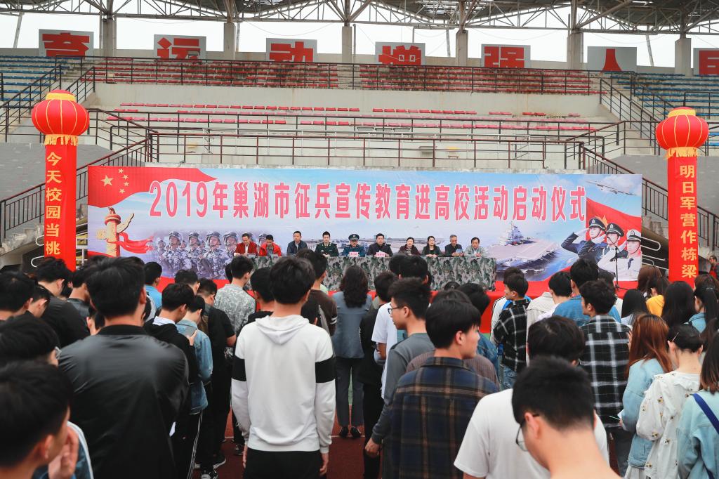 为进一步营造学校征兵工作宣传氛围,激发广大适龄大学生参军报国热情,4月22日下午,学校联合巢湖市人武部隆重举行2019年征兵宣传教育活动启动仪式。巢湖市委常委、人武部政委张学林,Beat365党委副书记胡其云出席启动仪式,学校征兵工作站成员,各学院征兵工作领导小组负责人和2000余名学生代表参加了启动仪式。仪式由巢湖市人武部参谋曹诗泽主持。