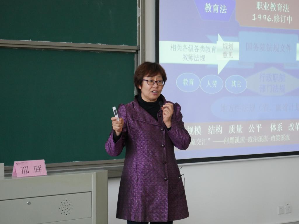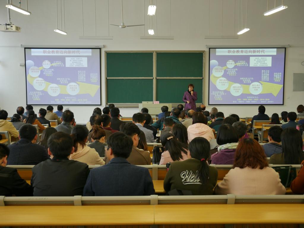 4月12日下午,国家教育行政学院学术委员会主任、教育行政教研部主任、职业教育研究中心主任邢晖教授应邀来Beat365作题为《高等职业教育新号角新策略》主题报告。报告会在Beat365汇心湖校区北教学楼101教室举行。Beat365各部门、各二级学院党政正副职负责人,教研室主任,汇心湖校区全体无课教师聆听了报告,报告会由副校长周晓隆主持。