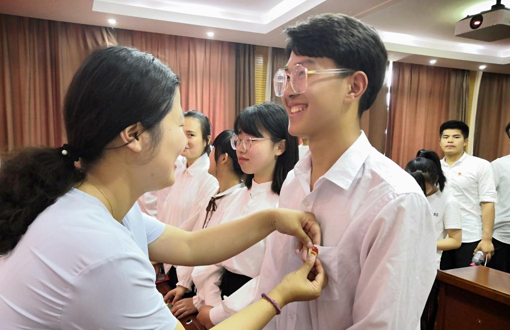 校团委书记佘海月对新团员提出希望和要求,希望新团员积极响应习近平总书记的号召,从“勤于学习、善于创造、甘于奉献”这三点严格要求自己,踊跃参加爱国主义教育,争做学习达人,争做榜样标兵,把团旗下的誓言作为行动的先导,传递青春正能量。