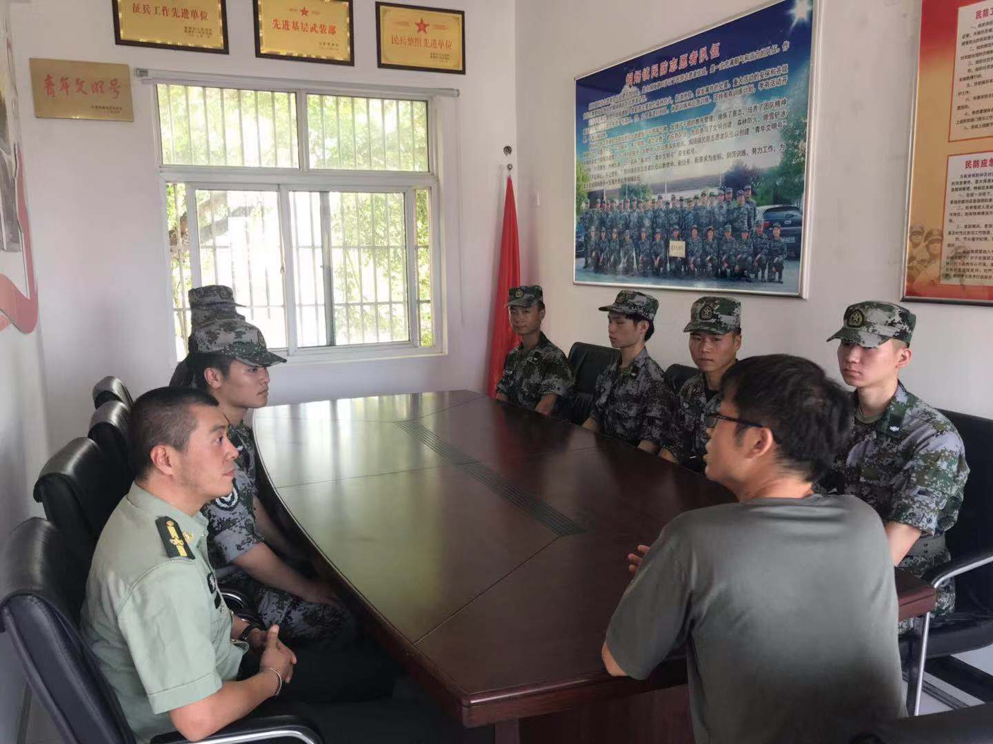 首先考察队来到了烔炀镇武装部,接待队员们的是烔炀镇武装部部长李光。在座谈中,李光向我们讲述了地方武装部的日常工作和深远社会意义。他向我们介绍到,今年镇上众多有为青年已经参加到2019年的征兵工作中来,月底,通过各项考核的同志将会批准入伍,加入到中国人民解放军这个大熔炉中来,锻造成钢筋铁骨,共同来保卫祖国和人民。听到这,在座的所有人都情不自禁的响起热烈的掌声。随后。考察队还参观了烔炀镇武装部民兵装备库,库里救援物资和应急物资一应俱全,如若灾情到来,武装部能够迅速整理物资并展开全面的救援工作。