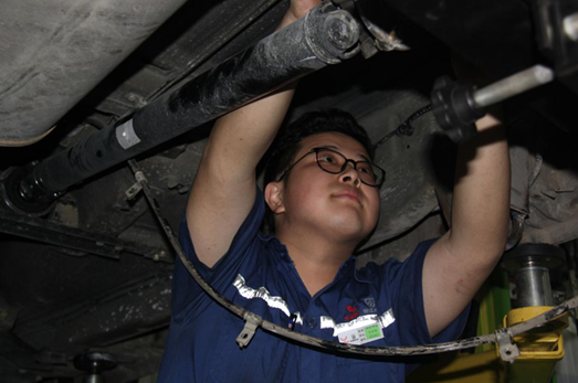 汽车检测专业实习学生在检查汽车底盘(上海五菱汽车销售有限公司)