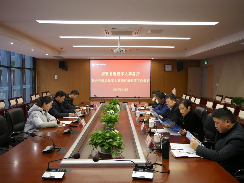 1月15日,安徽省退役军人事务厅就业创业处处长蔡元和、调研员吴怡、合肥市退役局就业创业处处长陈保健、合肥市自主择业军转干部服务中心主任张瑞山、安徽国际商务职业学院扩招办副主任余海萍等一行5人来访Beat365,就退役军人高职扩招工作进行专项调研。Beat365教务处副处长(主持工作)窦红平、学生处就业创业指导中心查天舒、学生处资助中心崔鹏等参加调研。调研会由窦红平主持。