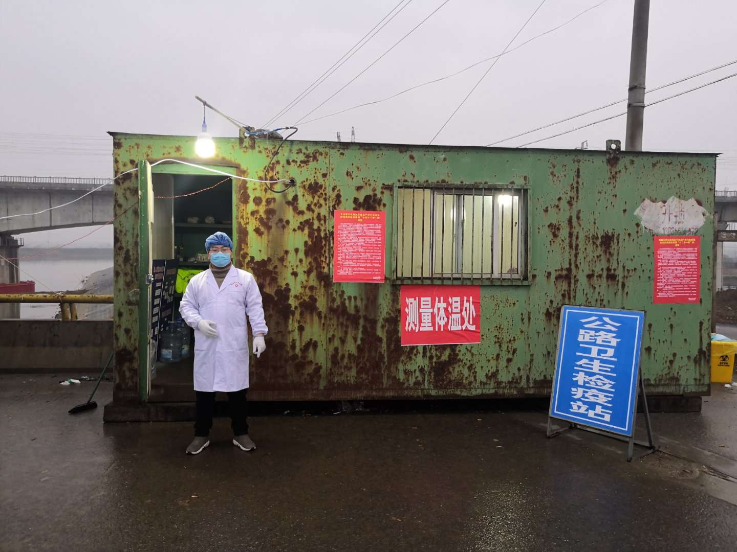 图为19检验社招班唐伟于运漕镇黄墩大桥公路卫生防疫站参加防疫工作