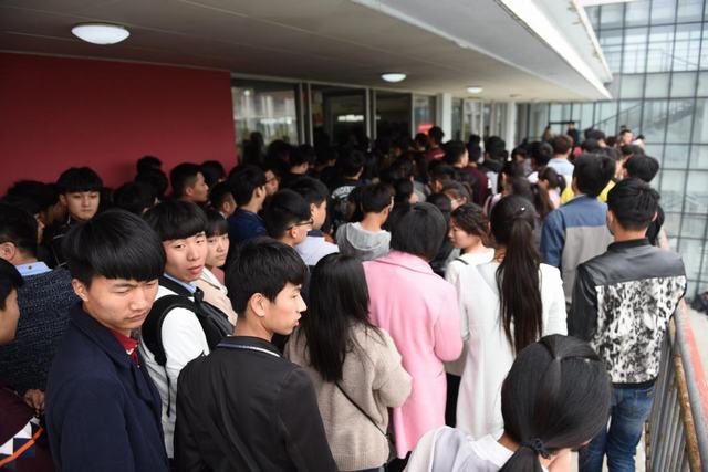 在报名现场等待入场的考生们。经历了排队的等候,快到自己了,他们的心中是否有些激动?