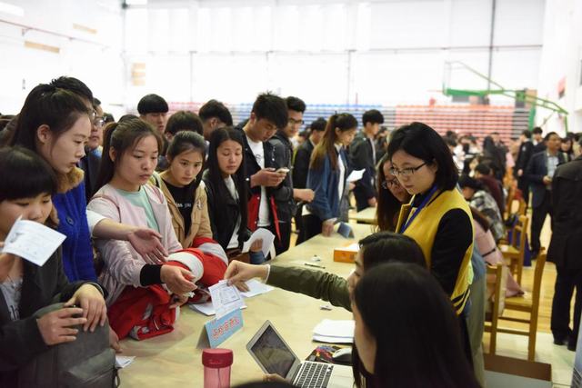 报名现场人头攒动,但却丝毫不显慌乱。考生们拿着报名材料,在工作人员的引导下自觉排成一列列整齐的队伍。