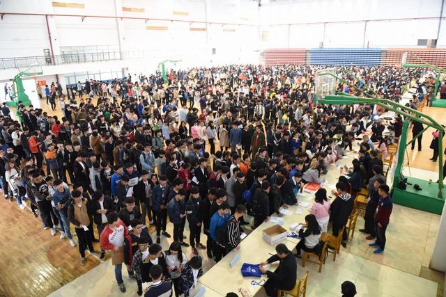 体育馆外,报名的考生排成一条长龙,井然有序地等候着报名。