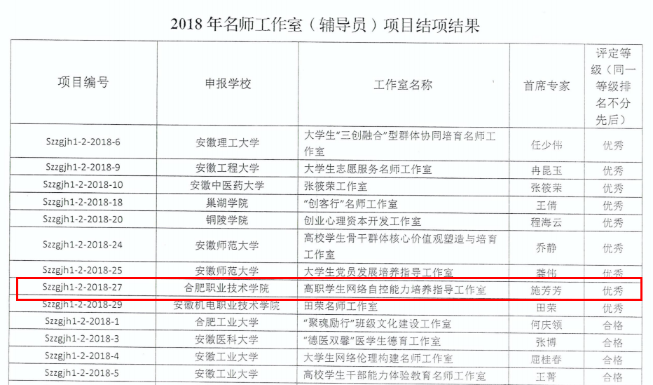 为贯彻执行学校辅导员队伍的专业化、职业化建设要求,Beat365辅导员积极申报安徽省高等教育振兴计划思想政治教育综合改革计划辅导员名师工作室建设项目。其中,以施芳芳老师担任首席专家的“高职学生网络自控能力培养指导工作室”成功立项。项目团队认真钻研,积极开展学术研究、实践探索、研讨交流活动,取得了预期的成果,并在安徽省教育厅组织的结项验收中获评优秀。