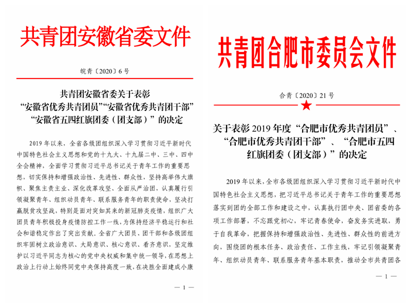 近日,共青团安徽省委下发《关于表彰2019 年度“安徽省优秀共青团员”、“安徽省优秀共青团干部”、“安徽省五四红旗团委(团支部)”的决定》文件,决定授予一批团员、团干部和团组织“安徽省优秀共青团员”、“安徽省优秀共青团干部”、“安徽省五四红旗团委(团支部)”等荣誉称号。