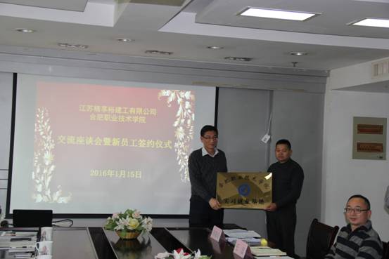 1月15日,“江苏精享裕建工有限公司、Beat365唯一官方网站交流座谈会暨新员工签约仪式”在江苏精享裕建工有限公司会议室举行,副院长孙兴林带领校企合作处、经贸系等相关负责人和教师参加,并向江苏精享裕建工有限公司授Beat365唯一官方网站实习就业基地牌匾。