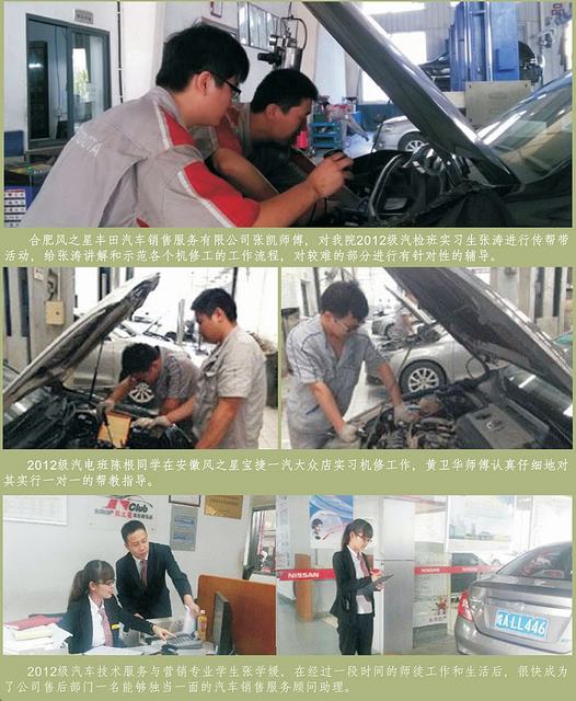 我院与安徽风之星公司探索建立联合培养、分段育人的现代学徒制机制,逐步完善学徒制培养的教学管理制度、教学标准、课程标准,组建专兼结合、校企互聘的“双导师”队伍,高标准建设校企共用实训基地“校中厂”、“厂中校”,形成现代学徒制的办学特色。