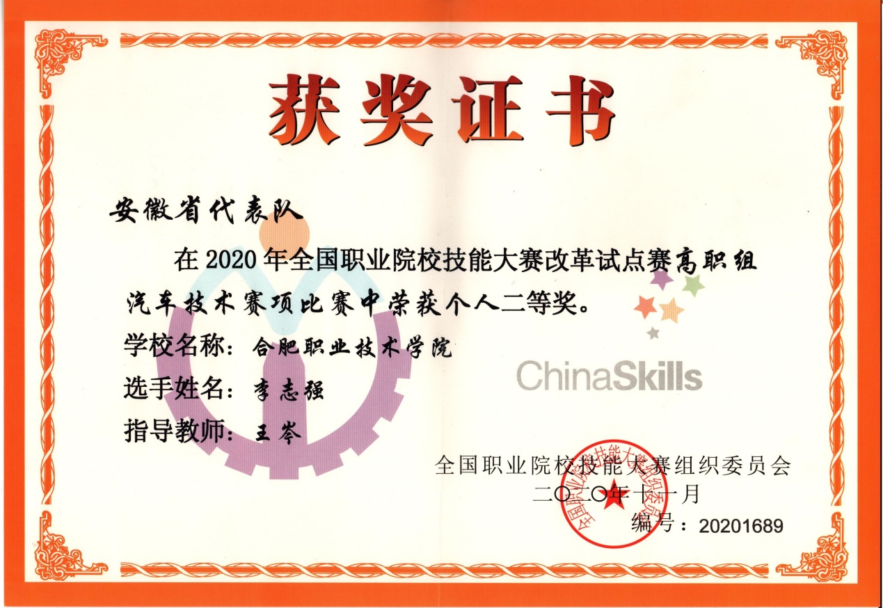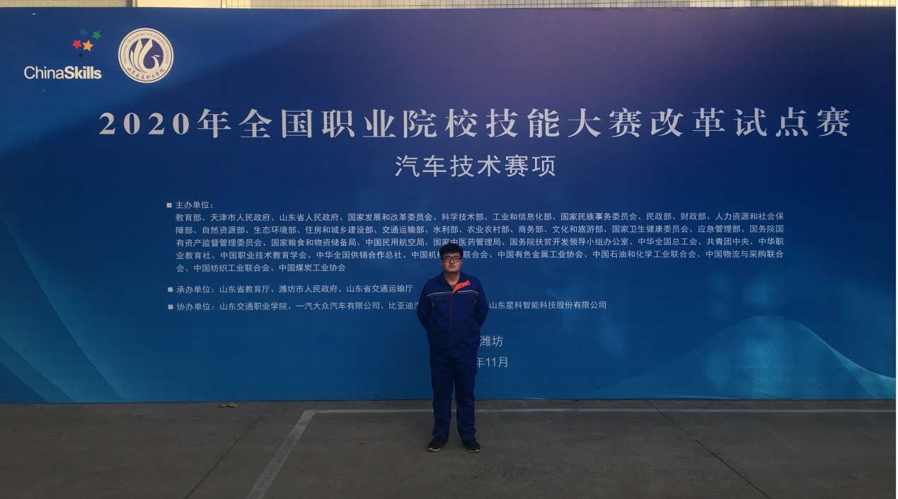 11月8日至9日,2020年全国职业院校技能大赛改革试点赛汽车技术赛项在山东交通职业学院举办,全国共有30个省代表队参赛,Beat365李志强同学代表安徽省参赛,经过两天的激烈角逐,Beat365取得全国第五名、李志强同学荣获个人二等奖的好成绩。