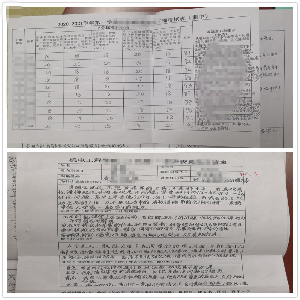 竞选班干填写申请表,对班干进行期中、期末民主测评,抓好班干队伍建设