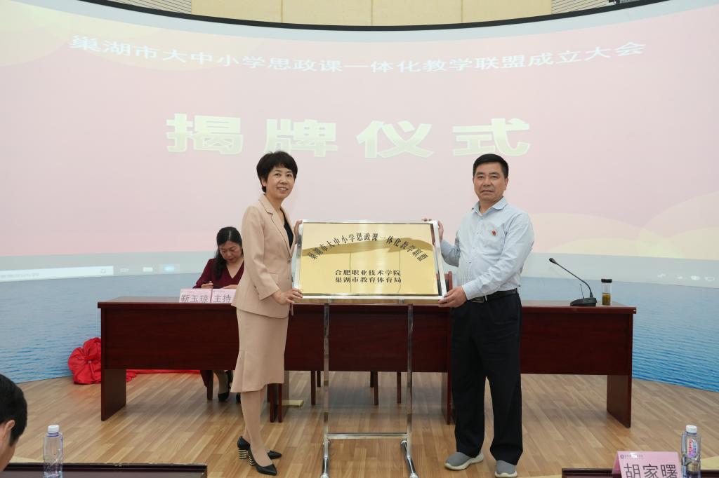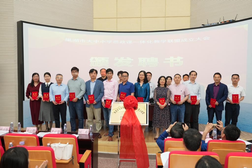 随后,胡其云和张文霞共同为联盟揭牌。巢湖市教体局教研室主任梁华明对《巢湖市大中小学思政课一体化教学联盟方案》进行全面解读,联盟的建设一是推进大中小学一体化的理论和实践,使思政课高度聚焦、力量一体推进,体现贯彻“守好一段渠、种好责任田”的整体水平和实效,服务于立德树人的目标。二是突出课程建设,注重一体化建设的总体谋篇布局、长远规划,构建大中小学思政课“共研、共教、共评”机制,让大中小学思政课教师从“背靠背”转向“面对面”。三是探索大中小学一体化思政课程建设及教师研修规律,破解思政课程一体化建设中的瓶颈问题,实现大中小学思政课教学衔接和课程质量提升,为构建大中小学一体化课程建设长效运作机制发挥出示范引领作用。四是加强合作单位、联盟学校的协同联动,加强一体化建设的“朋友圈”联动的作用,推动“同上一堂思政课”教学观摩常态化、制度化,实现学科课程体系、课堂教学体系、实践教学基地、教学评价体系、思政课教师队伍等一体化建设,为探索形成可复制、可推广的体制机制建设经验、推动能级提升作出努力。随后,胡其云、张文霞等领导为教学指导委员会委员颁发了聘书。