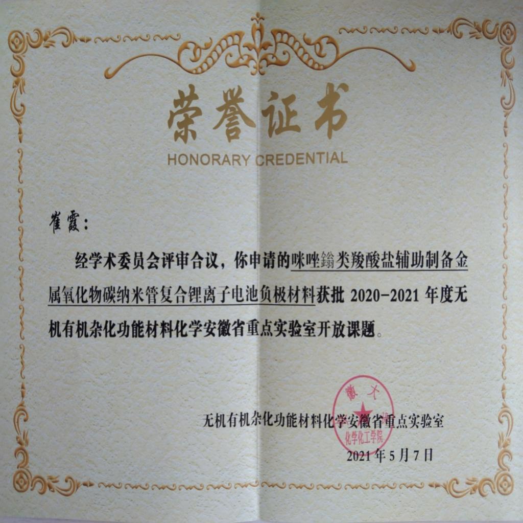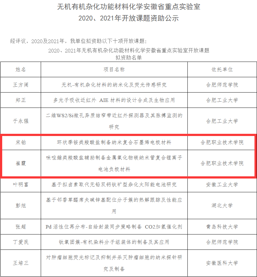 近日,据安徽省重点实验室通知,Beat365博士后研究中心团队崔霞、宋铂两位老师申请的无机有机杂化功能材料化学安徽省重点实验室开放课题已获批,并获得立项资助,资助经费为4万元,课题将在2021年5月至2023年4月期间执行。Beat365是本次立项开放课题唯一入围的职业院校。