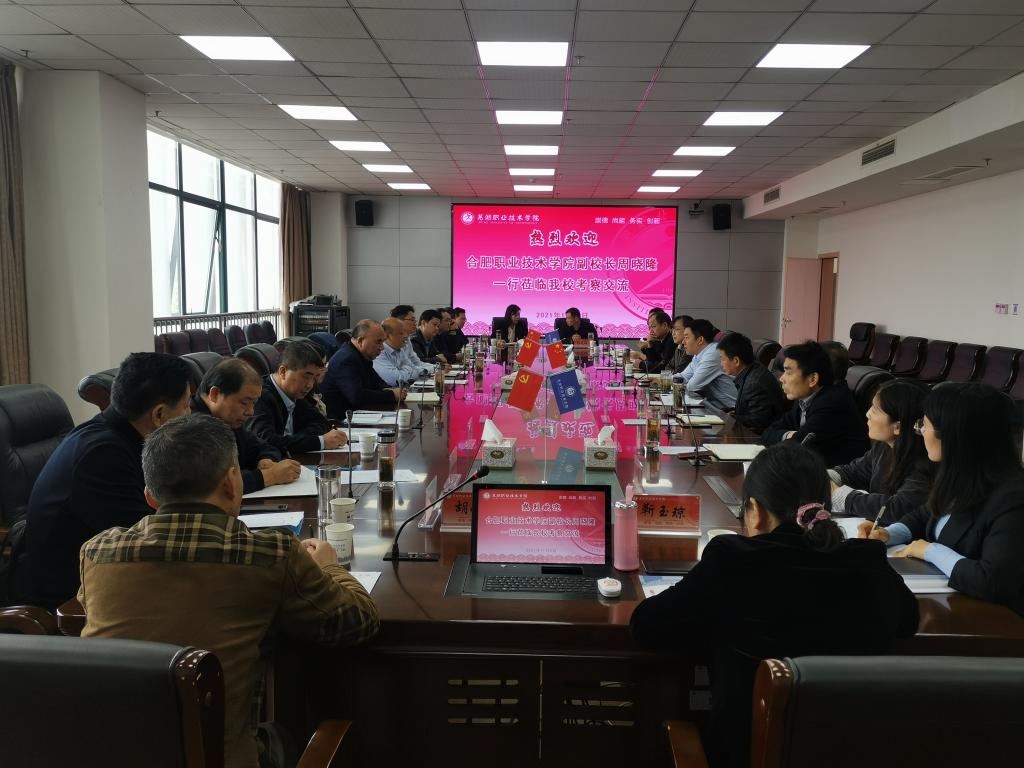11月2日,校党委委员、副校长周晓隆教授率队赴芜湖职业技术学院学习考察。二级学院院长,教务处、科技处、现代教育技术中心、教育教学督导评价中心等职能处室主要负责人一行16人参加。芜湖职业技术学院党委委员、副校长孙晓雷教授,部分二级学院院长,人力资源处、教务处、教学督导与质量监控处、信息化建设与管理处、科研处等职能处室的主要负责人热情接待考察组一行并召开了座谈会。