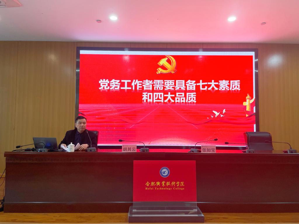校党委副书记胡其云结合自己多年的党务工作经历,对学校全体党务工作者提出“七大素质和四大品质”的要求,强调一名合格的党务工作者应善于学习,敢于担当,不断锤炼“实”的作风与“严”的品格。