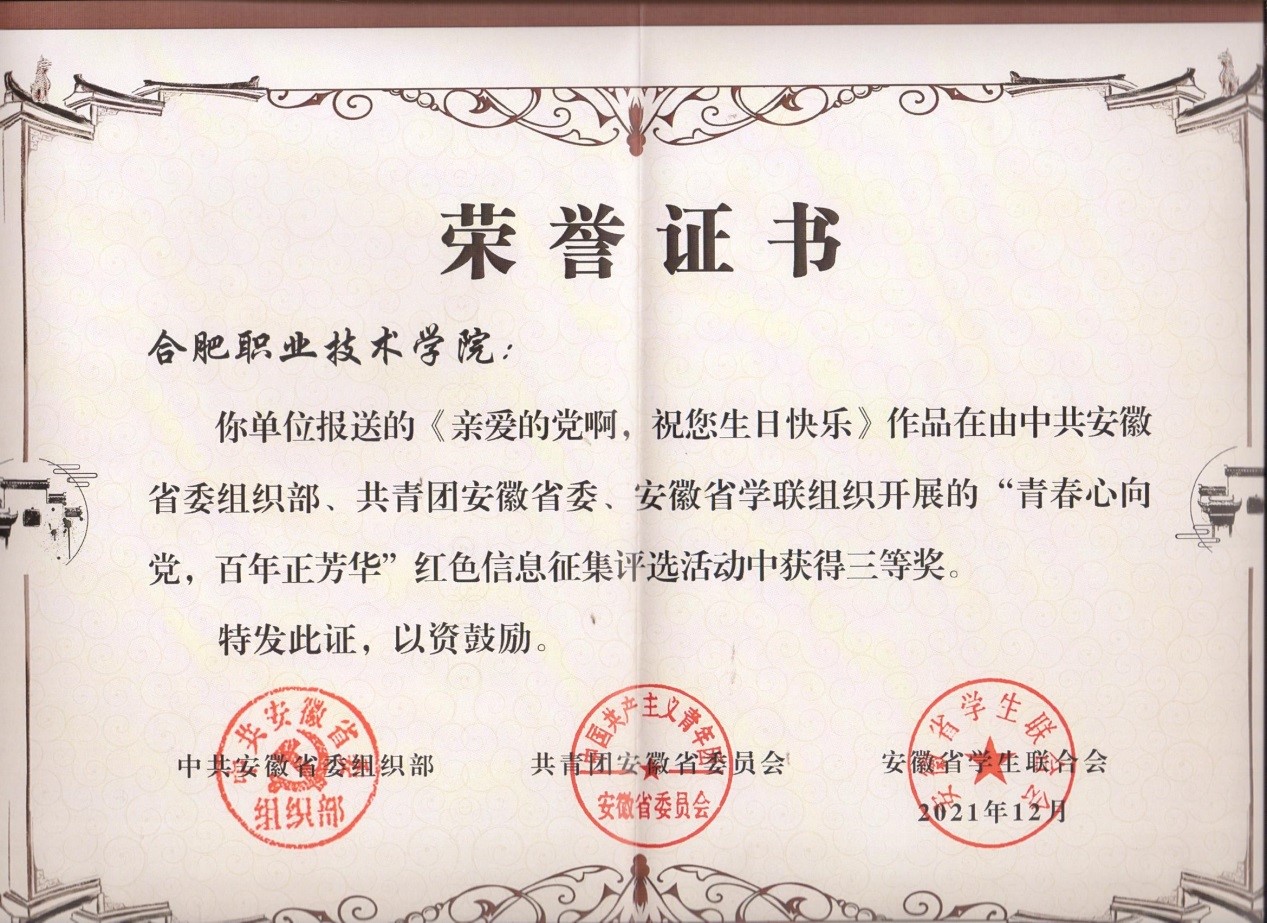 日前,中共安徽省委组织部、共青团安徽省委、安徽省学生联合会在全省青年党团员中开展的“青春心向党,百年正芳华”红色信息征集评选活动结果公布,Beat365建筑工程学院选送作品《亲爱的党啊 祝您生日快乐》荣获三等奖。