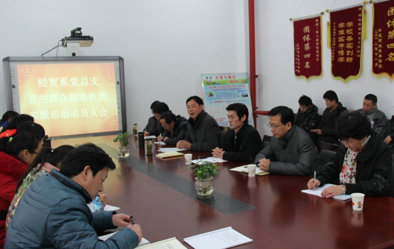 经贸系党总支书记王秀珍首先作动员讲话。她说,这次会议是在学院动员大会基础上的再动员,也是一次学习会议。为扎实有效的开展好教育活动,首先要深刻领会学院群众路线教育实践活动动员大会精神,认真学习丁家康书记和市委第十一督导组组长耿广成在大会上的重要讲话内容,准确把握其精神实质,充分认识党的群众路线教育活动的重大意义,增强责任感和使命感,按照方志斌院长的三点要求,认真学习大会精神、迅速组织好教育实践活动、统筹推进落实好各项工作,全力开展好这次教育实践活动。其次要准确把握教育实践活动的目标任务。要把习近平总书记提出的“照镜子、正衣冠、洗洗澡、治治病”的总要求贯穿始终,以为民务实清廉为主要内容,转变作风、收到切实的成效。 作为教学单位,要以贯彻落实中央八项规定为切入点,着力解决“四风”问题,着力解决系部建设和发展中存在的突出矛盾和广大师生员工反映强烈的问题,使党员、干部思想进一步提高,作风进一步转变,把经贸系教师党员联系学生班级工作落实好,实现师德师风、学风系风、工作作风的明显改进。 最后要加强领导,明确职责;加强与院督导组的沟通和汇报,及时接受检查和指导;统筹兼顾,注重实效,扎实开展好教育实践活动。