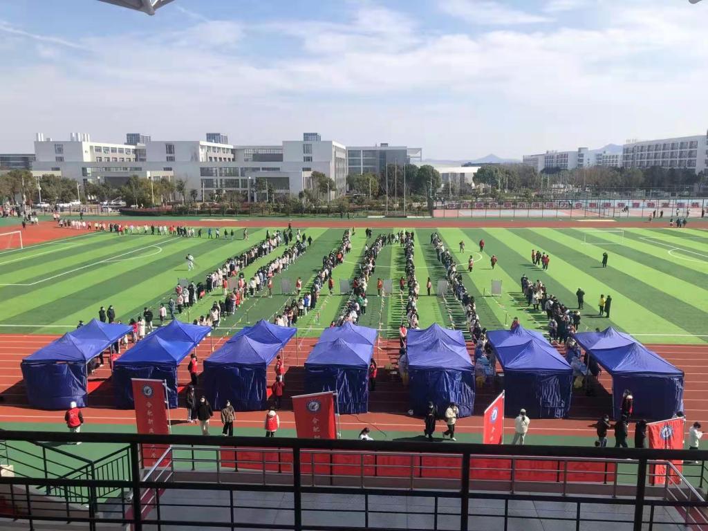 由于师生员工人数众多,为了充分疏散人群,尽量避免聚集,学校把田径体育场作为检测地点,设7个检测台。检测现场,分十人一组,保持安全间隔距离依次进行采样。采样现场实行单口进入、单口离开,人员不交叉,采样结束后,师生迅速离开现场。