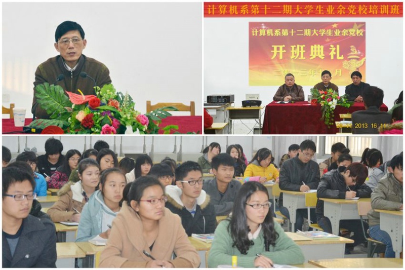 11月28日下午,计算机系在信息楼举行了第十二期大学生业余党校开班仪式,院党委副书记、副院长茆书斌同志应邀出席,并为业余党校上了第一堂党课《坚定信念、努力学习,做中国特色社会主义建设事业的合格接班人》。计算机系党总支、学生支部部分党员及本期全体入党积极分子参加了学习。