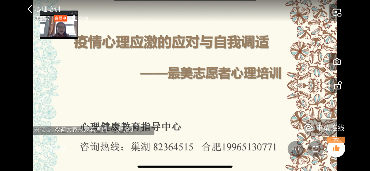 培训伊始,学校疫情防控领导组办公室(兼信息管理组)成员王文迪根据当前国内和省内疫情形势,向志愿者们传达学校的最新疫情防控政策和工作要求。随后,校医院工作人员谢莉玲医生从专业的角度,为志愿者们在线展示了如何正确佩戴口罩、七步洗手法等相关方面知识。接着,心理健康教育指导中心张洁主任凭借丰富的心理指导工作经验,为志愿者们开展一堂《疫情心理应激的应对与自我调适——最美志愿者心理培训》的专题培训。最后为答疑环节,老师们在群内逐一解答志愿者们在志愿服务中遇到的问题。