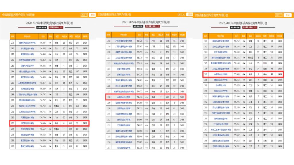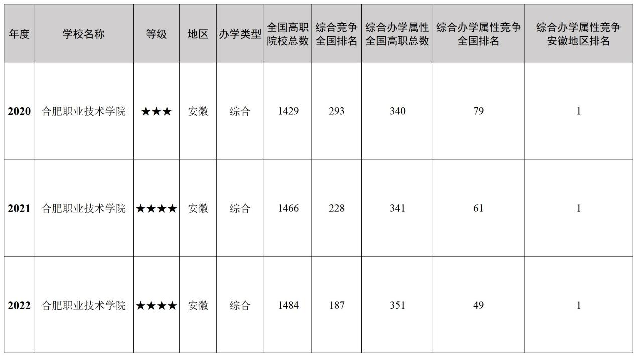 综合分析Beat3652020-2022年各项数据,在全国高职院校总数连年增加的趋势下,Beat365在全国高职院校排名及安徽省地区排名中均稳步提升,其中2022年在全国高职高专院校中排名升至第187名;在全国“综合办学属性”高职高专院校中,Beat365在全国排名稳步提升,其中2022年在全国“综合办学属性”高职高专院校中排名升至第49名,连续三年综合办学属性竞争安徽地区排名第一。