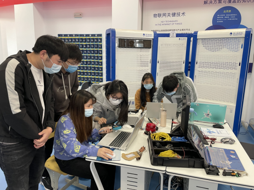 课上,他们走上讲台,又变成了老师、师傅,履行着他们肩上传道授业的责任。实训室里,他们为学生们演示安装传感器、连接电路、字体设计、图画创作,第一时间为学生解决项目实施中的任何问题,他们的身影穿梭在不同组别中,为的就是在有限的时间里,提高课程项目实施效率,让学生们都能得到实践,培养他们动手能力和创新能力,同时不断提醒他们保持距离,注意个人防护。没有完成任务的组别,申请晚上继续来实训室操作,童友波老师们总是一直指导到最后一位学生离开实训室。