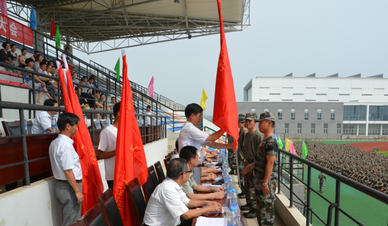 大会的最后,由院党委副书记、副院长茆书斌向军训团以及军训团直属队和各营授旗。大会结束后,我院2013级新生军训正式开始。