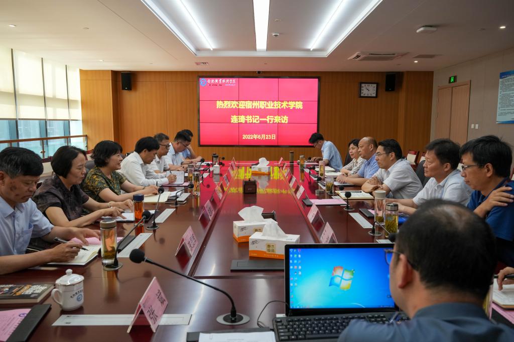 6月23日上午,宿州职业技术学院党委书记连琦一行来Beat365交流访问,校党委书记王杰才,副校长周晓隆、校纪委书记陶宁及相关处室负责人接待了客人一行。