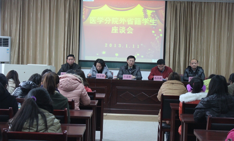 近年来学院每年在省外都有一定的招生计划,其中大部分学生集中在医学分院学习。为了更全面、深入地了解外省籍学生的学习生活情况,切实帮助学生解决学习生活中存在的实际问题,1月11号下午四点,医学分院党总支在医学楼北楼会议室召开医学分院外省籍在校学生座谈会。学院院长方志斌、副院长孙兴林、招生就业处和医学分院负责人以及医学分院学生工作人员,与医学分院外省籍67位在校生欢聚一堂,倾情交流。座谈会由医学分院党总支书记高恒平主持。