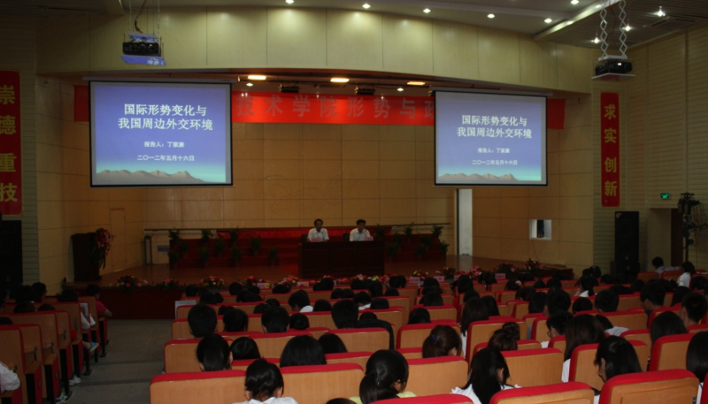 5月16日下午,大学生活动中心座无虚席。院党委书记丁家康在这里为同学们作了一场题为“国际形势变化与我国周边外交环境”的形势与政策报告。