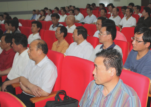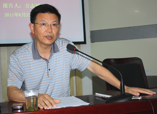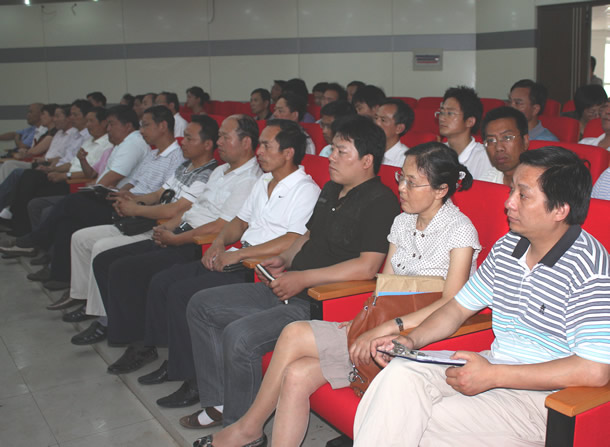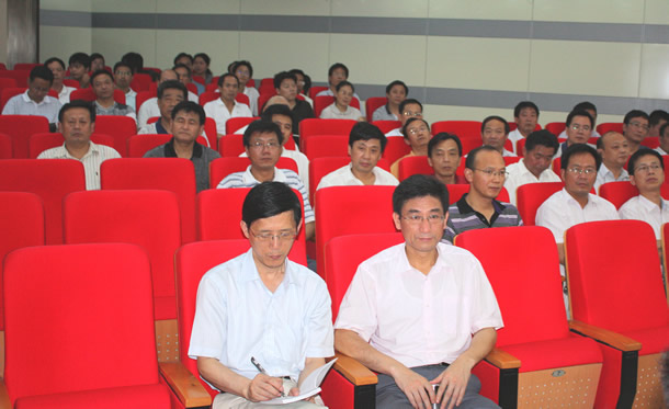 6月23日下午,学院党委在图书馆报告厅举行“以人为本 执政为民”主题教育活动党课报告会。 院党委书记丁家康主持报告会并作讲话,院党委副书记、院长方志斌作题为《把“以人为本、执政为民”贯彻到学院各项工作中去》的专题报告,院党委成员茆书斌、胡其云、孙兴林、金辉出席。来自全院副科以上的党员干部听取了报告。