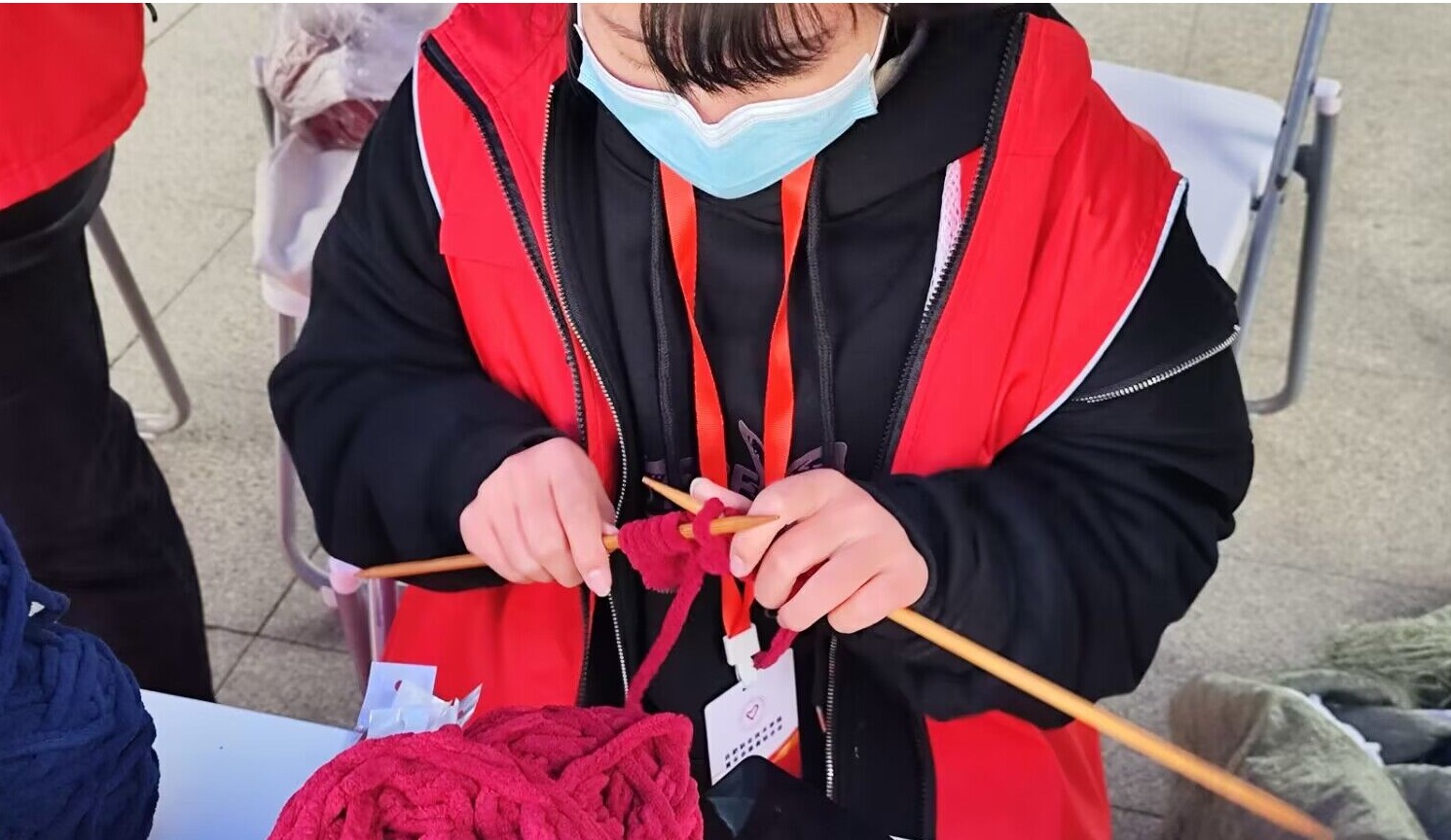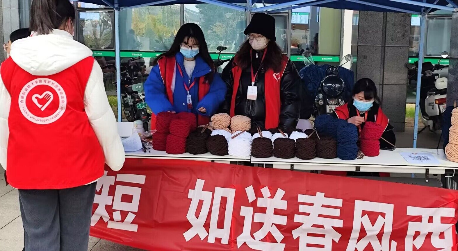 活动准备包括志愿者招募、物资采购和围脖编织。历时两天,共招募了近百位热衷于志愿服务的同学,准备了100人份的毛线团和300人份的姜汤,同时为了保证送到大家手中的姜汤是热乎的,还准备了保温袋为姜汤保暖。安排了有经验的同学专门指导围脖编织工作。