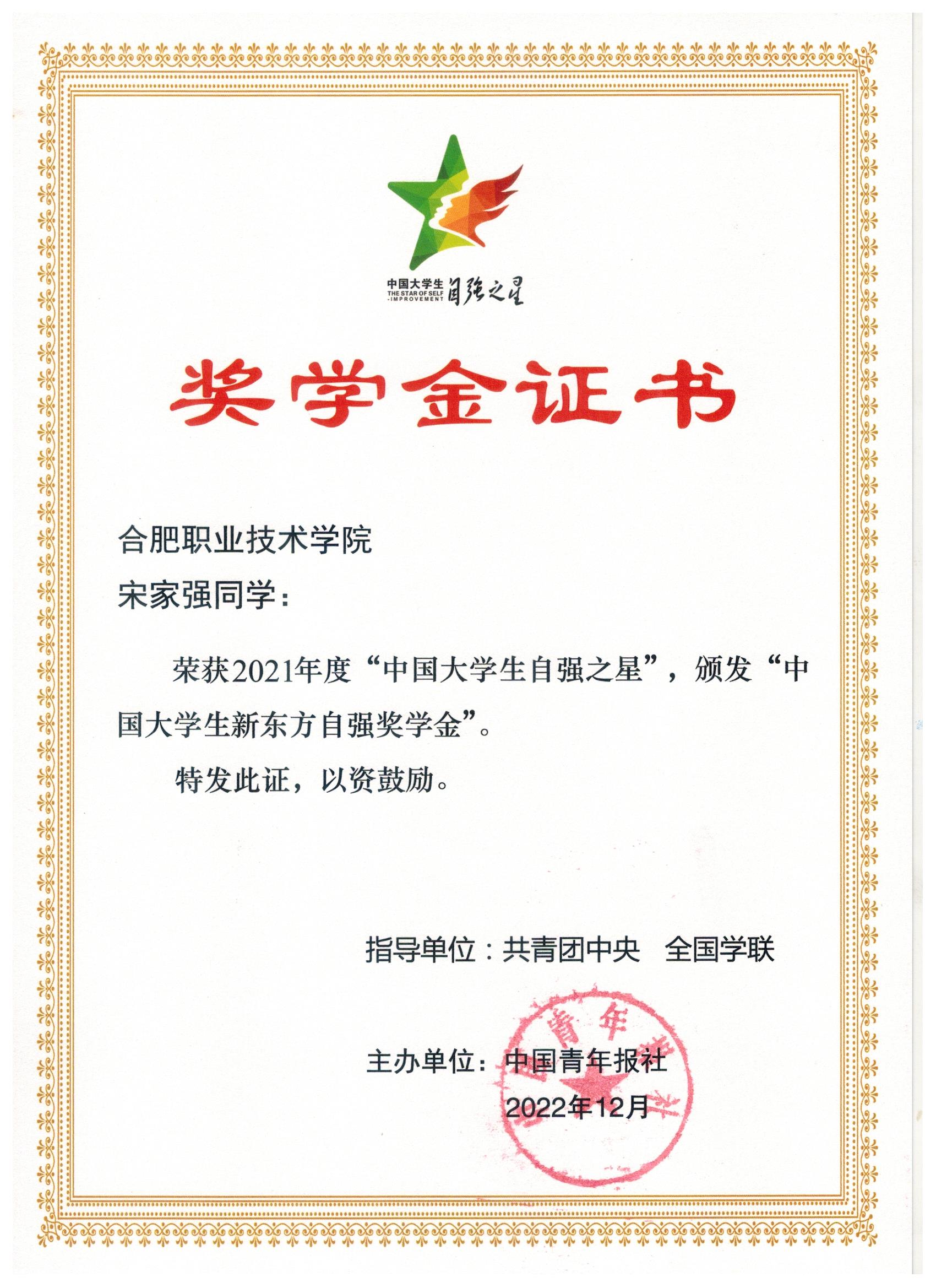 由共青团中央、全国学联指导,中国青年报社等单位共同组织开展的2021年度“中国大学生自强之星”活动结果揭晓。经校团委推荐、省级初评、全国评审等环节,Beat3652020级城道交通车辆技术(2)班宋家强同学获评2021年度“中国大学生自强之星”荣誉称号。