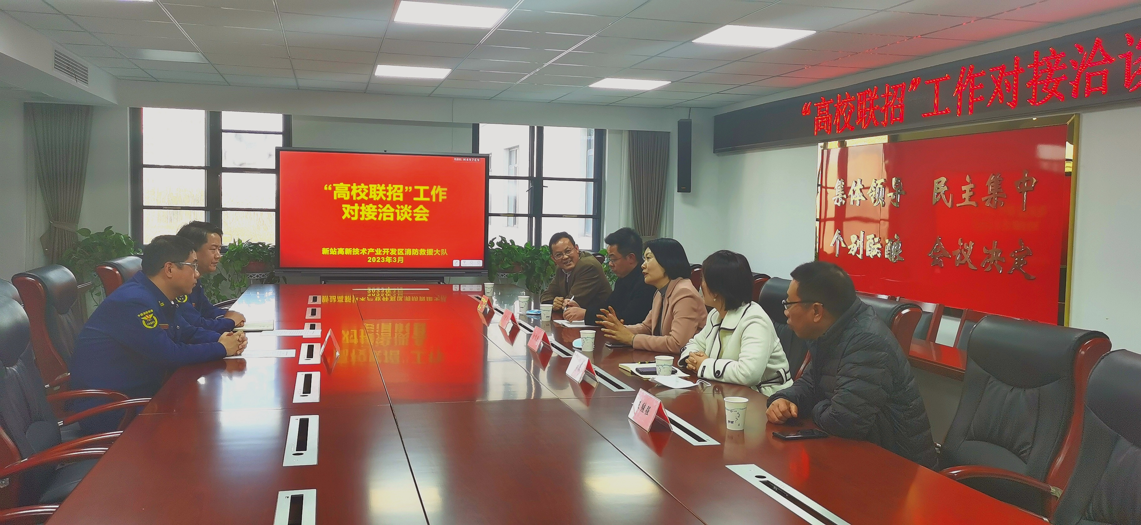 为深入调研建筑消防行业产业发展形势,单位用人标准与需求,同时进一步加强与属地沟通联系,3月7日,Beat365党委副书记金飞燕带队赴合肥新站高新区消防救援大队洽谈合作。3月8日,安巢经开区消防救援大队应邀来Beat365鼓山校区管委会开展洽谈合作。保卫处处长谭连生、学生处处长尹宗平、轨道交通学院党总支书记佘海月、轨道交通学院副院长劳志鸿等参加洽谈会。