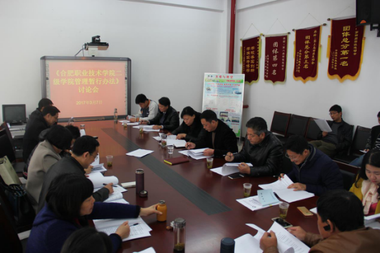 为了进一步完善我院《二级学院管理暂行办法》,建立起校院两级管理制度,3月7日下午,我院《二级学院管理暂行办法》讨论组第二小组在经贸系二楼会议室召开集中讨论会。会议由教务处处长宋风长主持。
