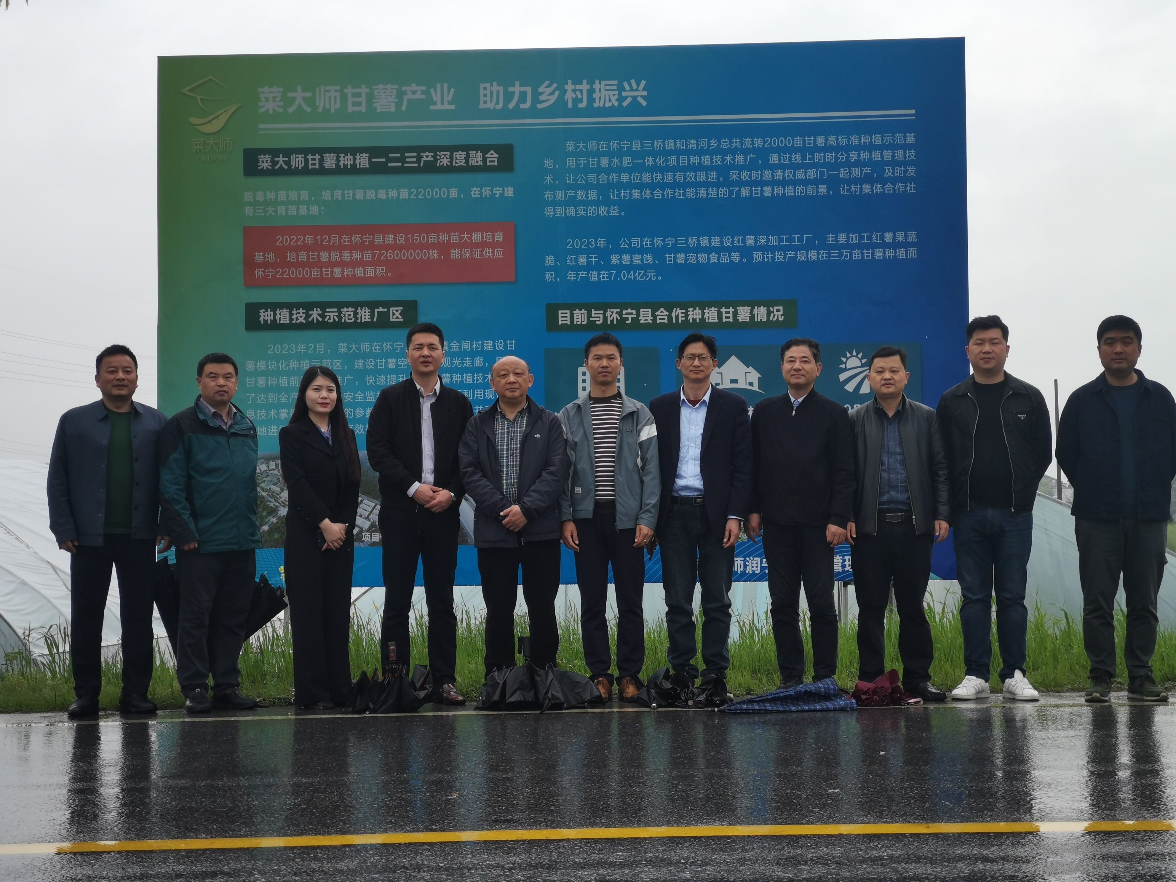 考察团参观了菜大师怀宁军民融合产业在建项目基地,深入了解了该项目现状。随后,考察团来到菜大师红薯育苗基地,了解红薯的种植及培育情况。双方就农业发展现状及相关产业情况、三产融合服务社会发展创新模式、数字智慧农业经济发展模式等课题进行了探讨,并就校企合作、产学研创合作、产业人才培养、服务社会发展路径等问题展开了深入交流。