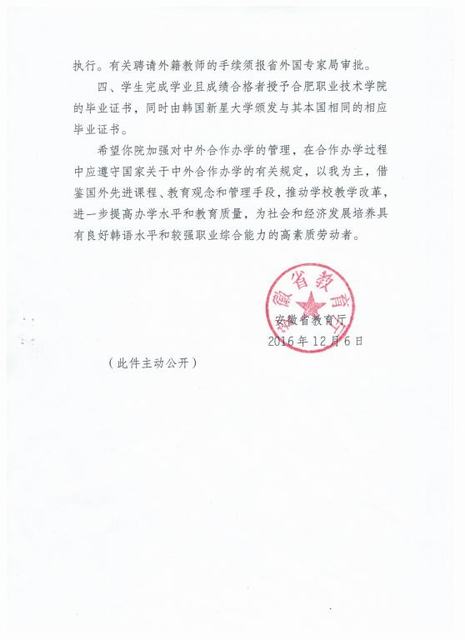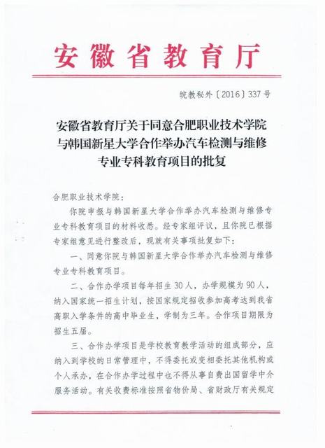 2016年12月6日,安徽省教育厅批准Beat365与韩国新星大学合作举办汽车检测与维修专业专科教育项目。该合作办学项目每年计划招生30人,并纳入国家统一招生计划,学制为三年。目前Beat365正在进行课程设置及招生准备工作。开放办学是Beat365的办学理念,近年来,学校积极争取与国外、境外院校合作办学,这次与韩国新星大学合作办学项目获得批准,是Beat365合作办学的又一重要成果。