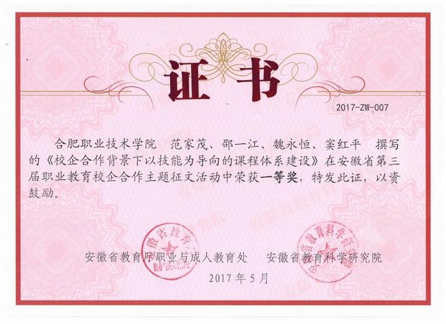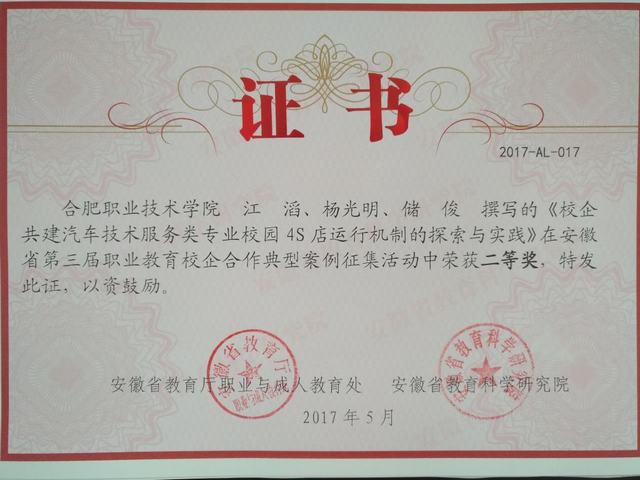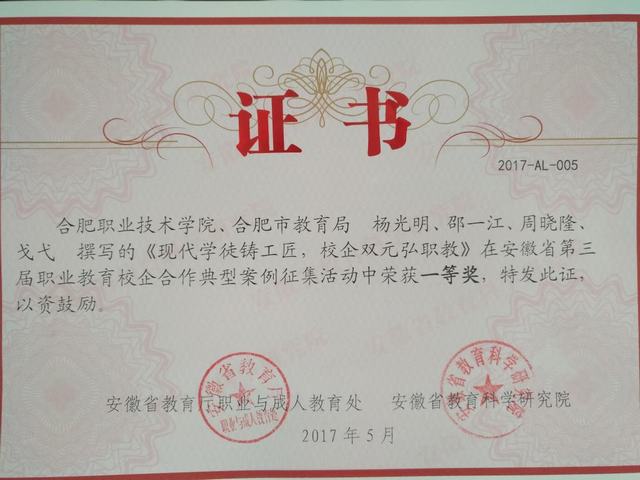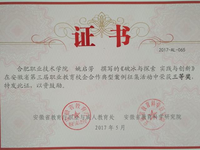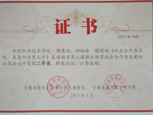 日前,在安徽省教育厅、安徽省教育科学研究院联合举办的“第三届安徽省职业教育校企合作典型案例征集和主题征文”评选中,Beat365选送的8篇作品取得了3个一等奖,3个二等奖,2个三等奖的优异成绩。