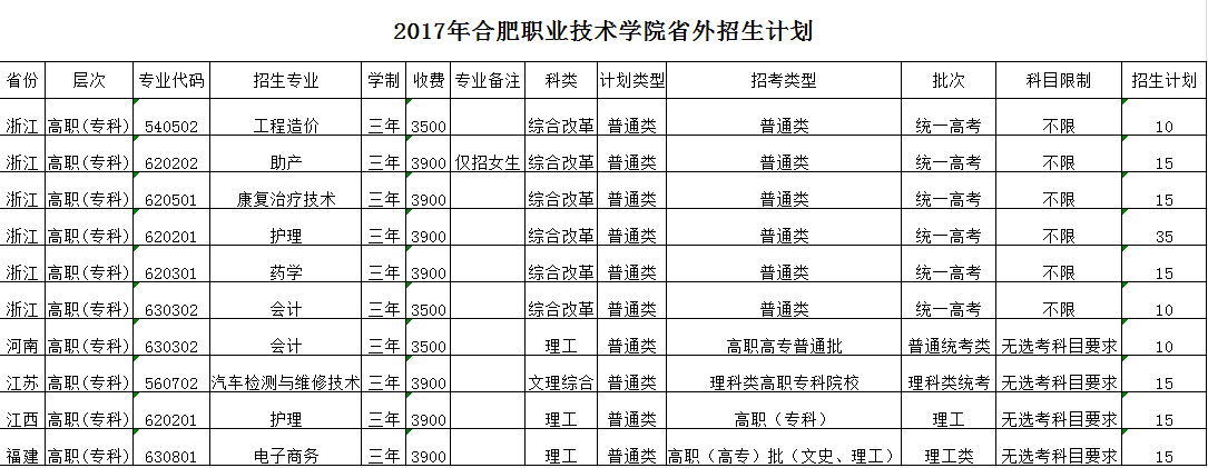2017年我院除省内招生外,还面向浙江、江苏、河南、江西、福建等5省跨省招生,投放计划总数155人次,其中浙江100人,江苏15人、河南10人、江西15人,福建省15人,涵盖医药卫生类(护理、康复治疗技术、助产、药学)、土木建筑类(工程造价)、财经商贸类(会计、电子商务)、装备制造类(汽车检测与维修技术)等4个专业大类8个招生专业。这些专业均为我院特色专业,也是与区域社会经济发展需求紧密结合的重点建设专业。