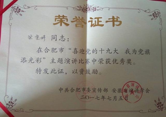 7月5日上午,中共合肥市委宣传部,安徽省演讲学会主办的“喜迎党的十九大,我为党旗添光彩”主题演讲比赛在合肥政务中心8号会议室举行,我院团委梁雯婷代表我院参加了本次比赛,此次比赛梁老师紧扣演讲主题,结合自身工作实际及从身边的实际,通过演讲形式娓娓道来,塑造了一个个立足岗位,无私奉献的典型形象,充分展示了Beat365唯一官方网站党员教师积极向上的精神风貌,经过激烈的角逐梁雯婷老师最终获得“优秀奖”,为我院增光添彩!(供稿:宣传部 编辑:敬涓)