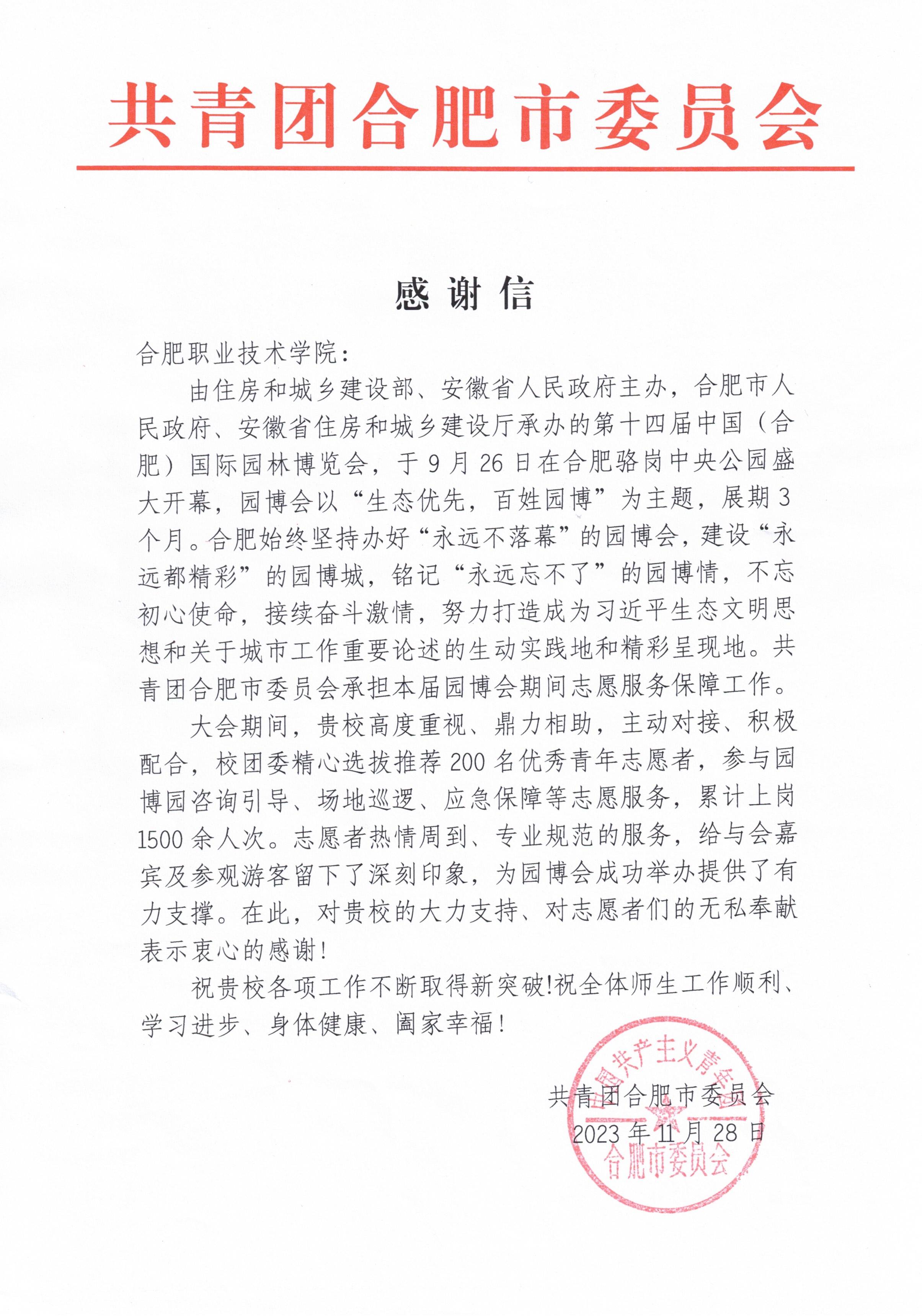 12月26日上午,历时3个月的第十四届中国(合肥)国际园林博览会圆满落幕。园博会期间,校团委精心选拔推荐200名优秀青年志愿者,参与园博园咨询引导、场地巡逻、应急保障等志愿服务,累计上岗1500余人次。活动结束后,共青团合肥市委发来感谢信,信上对Beat365青年志愿者热情周到、专业规范的服务和无私奉献的精神予以充分肯定,对Beat365的大力支持表示感谢。