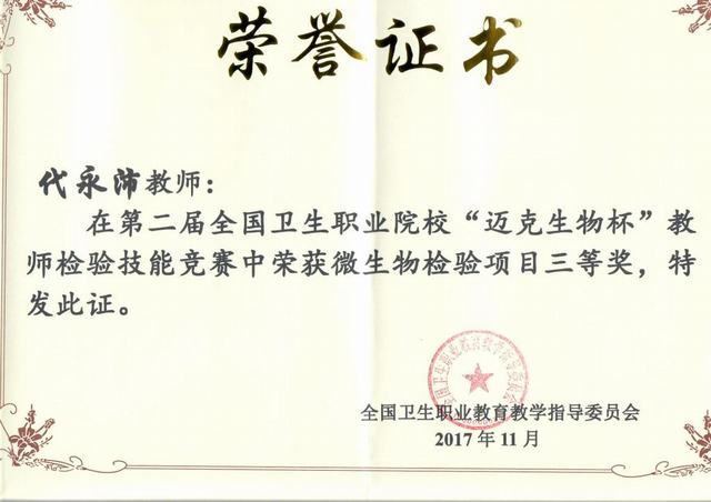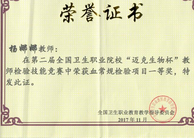 11月11日至14日,第二届全国卫生职业院校教师检验技能竞赛在重庆市举行。此次竞赛由全国卫生职业教育教学指导委员会主办,卫生行指委医学检验技术分委会、重庆医药高等专科学校承办,全国共27个省(市、自治区)的86所职业院校组队参赛,共有162名教师参加。Beat365医学院派出杨娜娜和代永沛两位年青老师参赛,经过3天的紧张激烈的角逐,杨娜娜老师荣获一等奖、代永沛老师荣获三等奖。