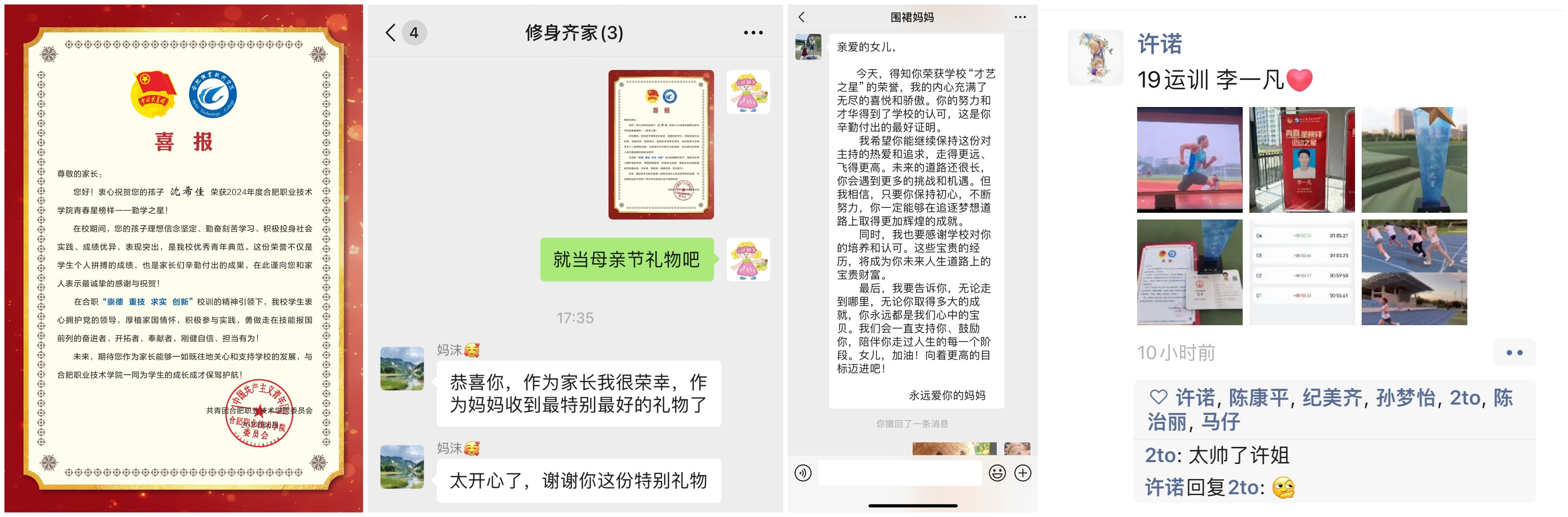 今年校团委首次为获得青春“星”榜样的同学家长寄去了贺信,也收到了学生家长们的热烈反馈。我们向所有关心、关注和支持学校发展,与学校携手一同为青年人成长成才保驾护航的家长们表示感谢,并致以青春的敬礼!
