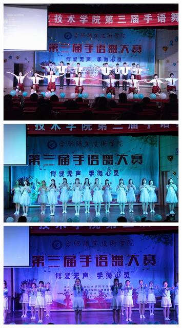 温馨的音乐,灵动的手语,璀璨的舞台,热情的观众,合职学子集聚一堂。来自六个二级学院共计12支参赛队伍的表演精彩纷呈,尽显风采。灯光下的舞者用手之舞,表心之语,轻柔的指尖,舞动出爱的奇迹,带给观众视觉的享受与心灵的感动。动感振奋的《我相信,年轻的战场》,古韵大气的《国家》,阵容庞大,动作整齐划一,点燃了在场每一个人的热情。天使般真情演绎的《遇见》、轻扬曼舞的《没什么不同》用无声的手语划出了唯美,深深感染了在场的每一位观众。《父亲》静默不语,却爱的深沉;《时间都去哪儿了》匆匆然,那份爱,已经嵌在内心最深处。同学们用真情演绎出了“亲情”,那份最特别的疼爱,是时光沉淀的恩典。《我们的故事》用不同情景演绎了我们青春、烦恼、奋进……别出心裁的队形转换,细腻流畅的动作展示,舞蹈与手语巧妙结合,勾勒出一幅幅动人的画面,手语之美,尽显其中。
