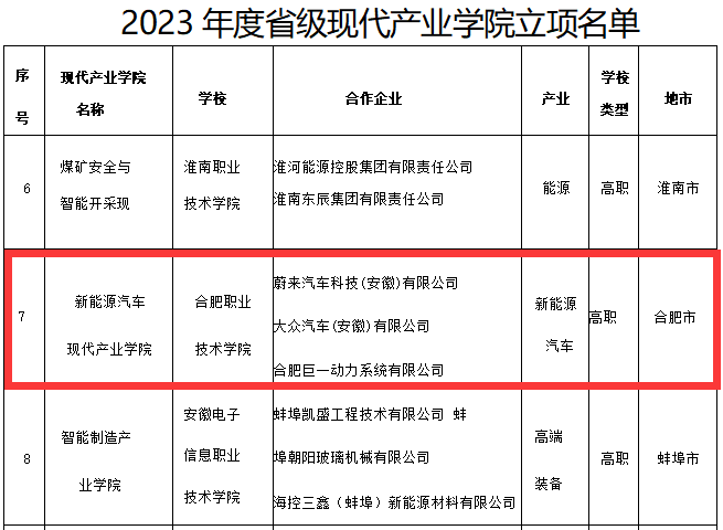 日前,安徽省教育厅正式公布“2023年度省级职业院校现代产业学院”立项名单,Beat365联合蔚来汽车科技(安徽)有限公司、大众汽车(安徽)有限公司 、合肥巨一动力系统有限公司申报的“新能源汽车现代产业学院”成功获批。