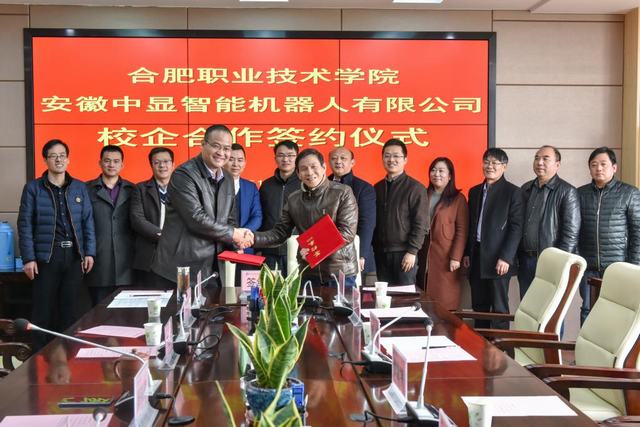 12月27日,合肥巢湖经开区招商局局长刘智、副局长李凡、人事局局长刘晓利和安徽中显智能机器人有限公司(以下称安徽中显)首席执行官余金坤、运营官吴春庚等一行来Beat365签订校企合作战略协议。副校长周晓隆、科技处处长朱道林及机电工程学院相关负责人出席签约仪式。签约仪式由朱道林主持。